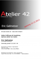 Il giorno 12/12/2013 alle ore 19 inauguriamo l`"Atelier 42" con la mostra dell´artista + designer ERIC GALLMETZER. E`uno spazio incantato, dove viene creato, esposto e illustrato arte.