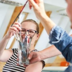 Farbstifte, Tempera- oder Wasserfarben, Pinsel und Wasserglas. Malblätter stehen bereit und sind im Preis inbegriffen sowie eine kleine Auswahl an verschiedenen Farben
